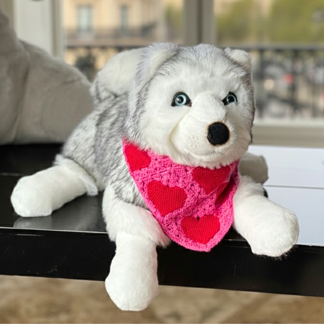 Des peluches pleines de tendresse, habillées d’un bandana rose en crochet orné de cœurs, pensées pour dire je t’aime tout en douceur.