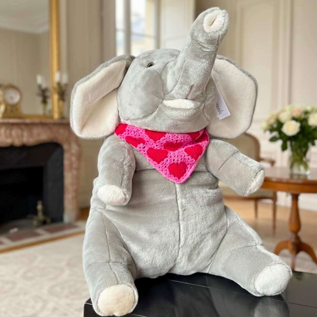 Basile est le compagnon idéal pour les grands câlins et les moments réconfortants. Son format généreux et son bandana rose à cœurs en font une peluche spectaculaire et rassurante.
